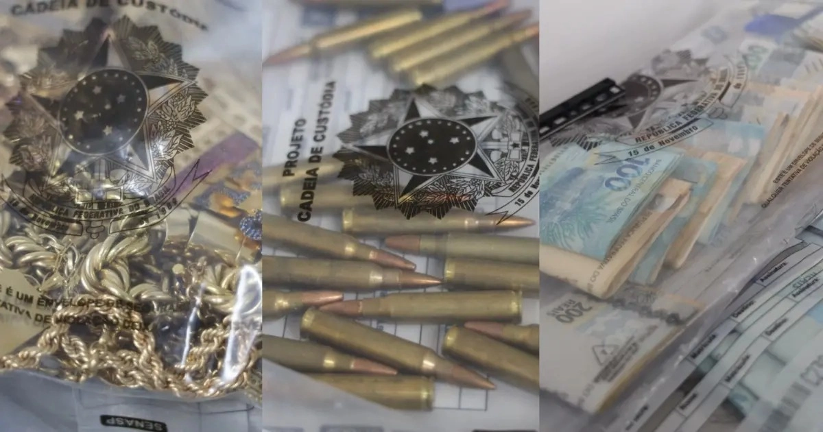 Também foram recolhidos 30 celulares, R$ 35,4 mil em espécie, três carros, três motocicletas e joias de ouro, incluindo correntes, pulseiras e anéis. Todo o material será periciado.