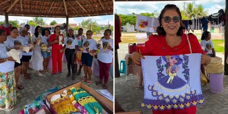 Durante a feira, foram comercializados diversos produtos da agricultura familiar, como farinha, feijão, biscoitos, frutas, doces e tapioca, além de outros alimentos preparados pelas próprias produtoras. O espaço também contou com a exposição de artesanatos, incluindo panos de prato bordados, peças em crochê e outros trabalhos manuais produzidos pelas moradoras da comunidade.