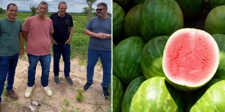 O prefeito Nixon Duarte, o vice-prefeito Cristian Santana e secretários acompanharam a produção de melancias na Fazenda Santo Antônio | FOTO: Montagem do JC |